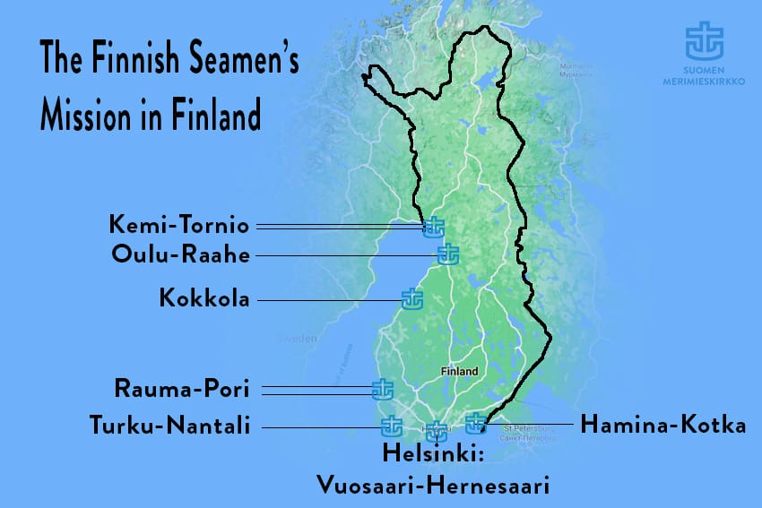 The largest customer group of the Seamen’s Churches in Finland has traditionally consisted of foreign seafarers. Currently, there are seven operational locations in the country. Port chaplains also serve seafarers in nearby ports within their regions.